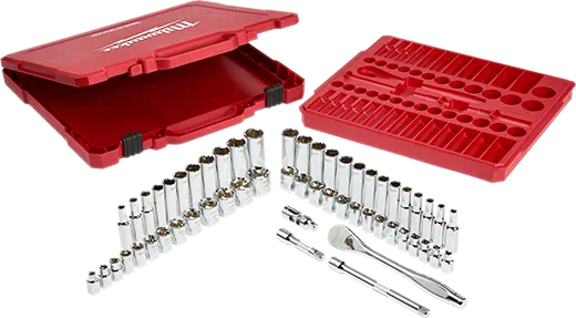 Notre jeu de clé à rochet et de douilles à prise de 3/8 po MILWAUKEEMD SAE de 56 morceaux est conçu de la base pour offrir aux utilisateurs les douilles les plus polyvalentes de conception antiroulement et prêtes pour une clé. Sa conception FOUR FLATMC résiste au roulement et permet d’utiliser une clé facilement. La clé à rochet à 90 dents offre un débattement de 4° et un profil mince vous permettant de travailler dans des endroits plus restreints, que ce soit sous le capot d’une voiture ou dans des travaux de rénovation. Le kit de clé à rochet et de douilles comprend un plateau intérieur amovible parfaitement conçu pour le rangement à long terme dans un coffre de rangement en acier. Les mesures métriques et SAE sont estampées dans toutes nos douilles sur le côté plat afin de faciliter la lecture. Il comprend également un robuste coffret de transport pour la portabilité optimale. Le jeu comprend des accessoires afin que nos utilisateurs puissent accomplir toutes les tâches, dans le garage ou sur le chantier. Notre jeu de clé à rochet et de douilles est appuyé par une garantie à vie.