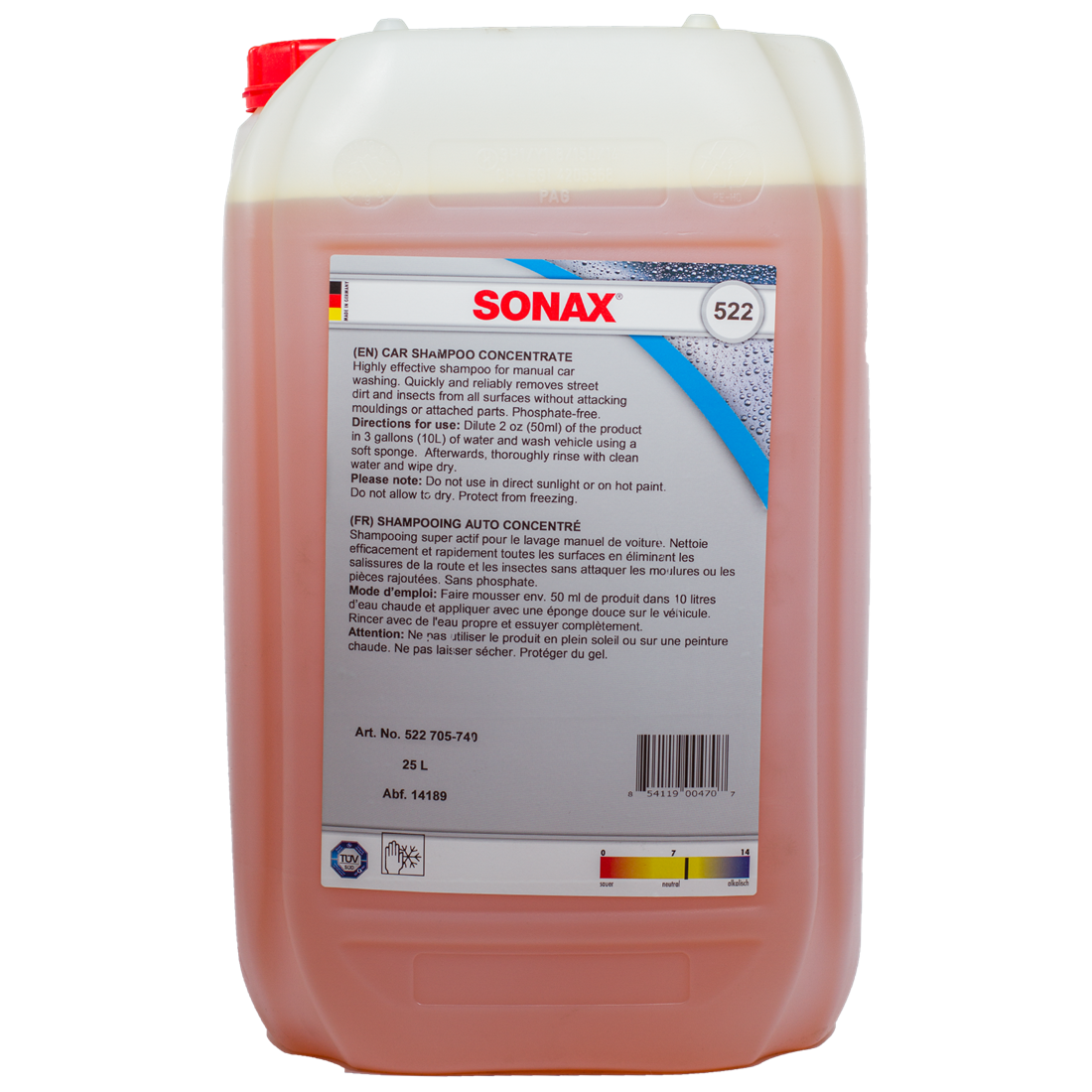SONAX Car Shampoo Concentrate is a brilliant, surfactant-rich formula. Thick lathering action and pleasant scent. SONAX Car Wash Shampoo Concentrate is a highly effective, phosphatefree and pH-neutral formula that penetrates and loosens tough dirt without damaging or stripping the protective layer. The special anionic surfactants within, simultaneously adhere and distribute dirt leaves a brilliant, clean shine to your paint, rubber, plastic, vinyl and glass surfaces every time! Directions 50ml (2oz) in 10L (3 gallons) of warm water.